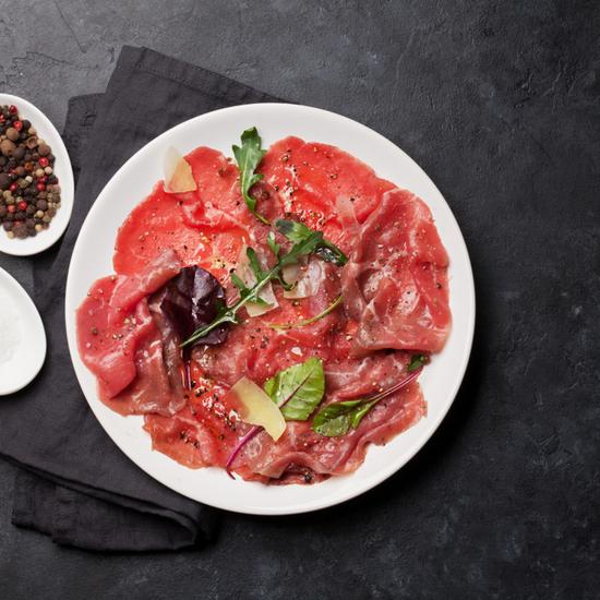 100 gram carpaccio (diepgevroren). Alleen vlees, zonder dressing en kaas. U kunt dit langzaam laten ontdooien.